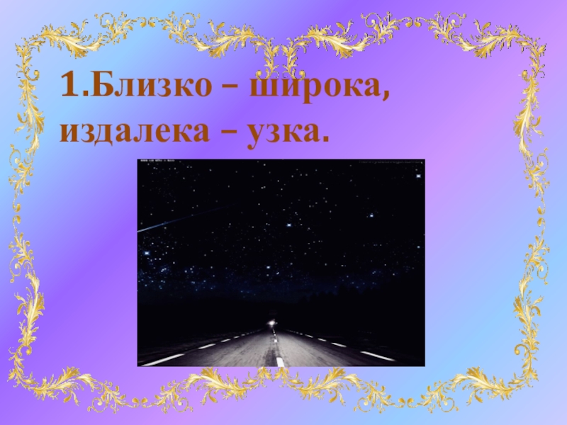 Слайд 221.Близко – широка, издалека – узка.