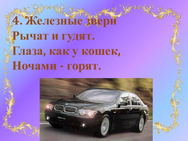 4. Железные звери  Рычат и гудят. Глаза, как у кошек, Ночами - горят.