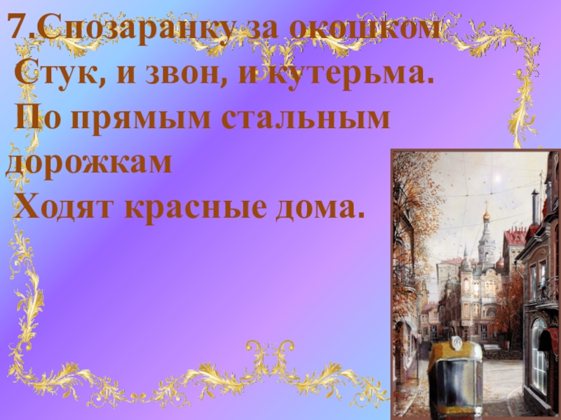 7.Спозаранку за окошком  Стук, и звон, и кутерьма.  По прямым стальным дорожкам  Ходят красные дома.