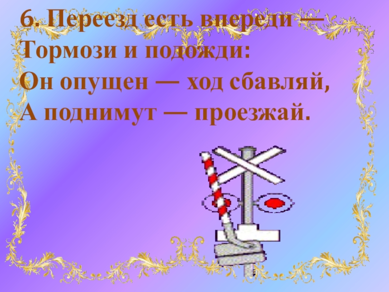 6. Переезд есть впереди — Тормози и подожди: Он опущен — ход сбавляй, А поднимут — проезжай.