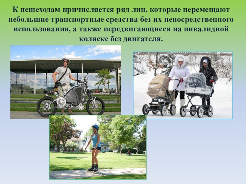 Слайд 12К пешеходам причисляется ряд лиц, которые перемещают небольшие транспортные средства без