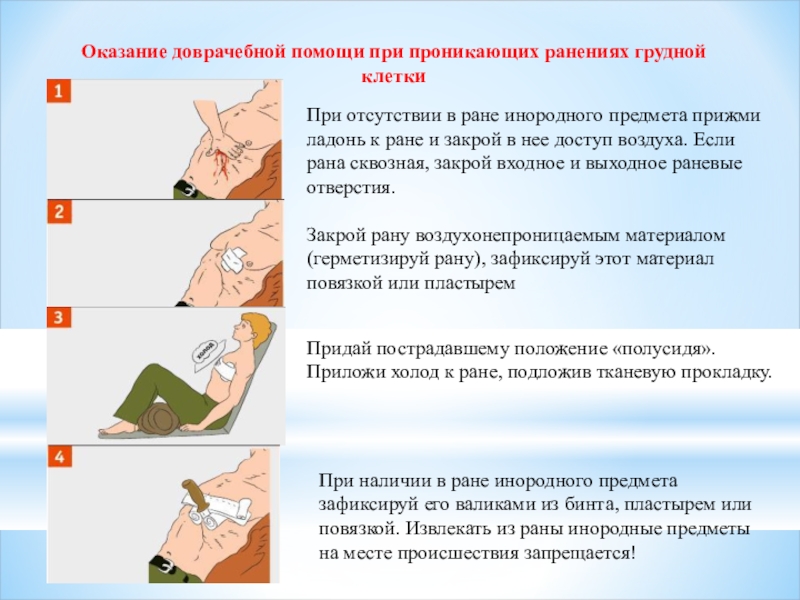 инородного предмета прижми ладонь к ране и закрой в нее доступ воздуха. Если рана сквозная, закрой входное и выходное раневые отверстия.