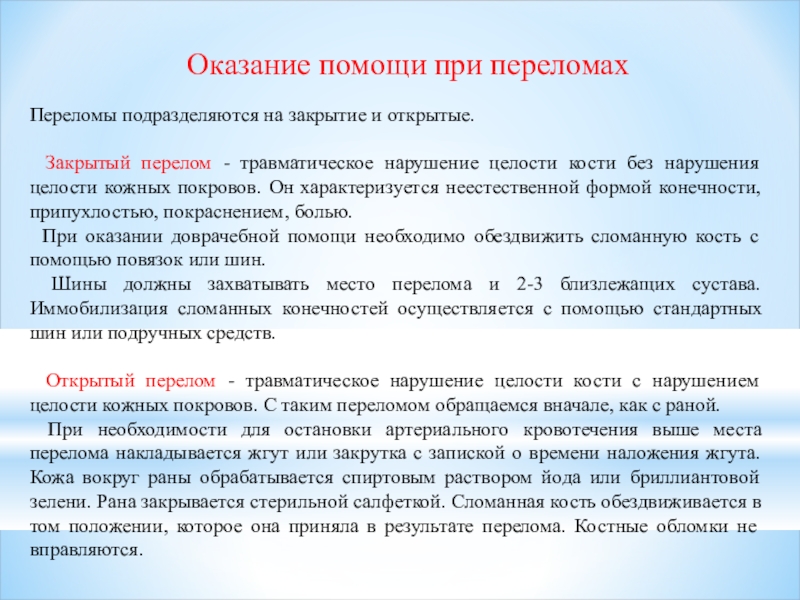 При необходимости для остановки артериального кровотечения выше места перелома накладывается жгут или закрутка с запиской о времени наложения жгута. Кожа вокруг раны обрабатывается спиртовым раствором йода или бриллиантовой зелени. Рана закрывается стерильной салфеткой. Сломанная кость обездвиживается в том положении, которое она приняла в результате перелома. Костные обломки не вправляются.