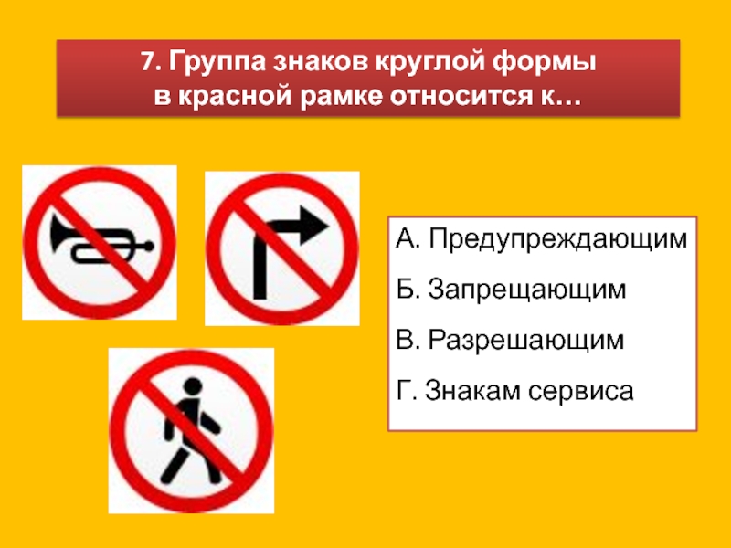 А. ПредупреждающимБ. ЗапрещающимВ. РазрешающимГ. Знакам сервиса7. Группа знаков круглой формы в красной рамке относится к…