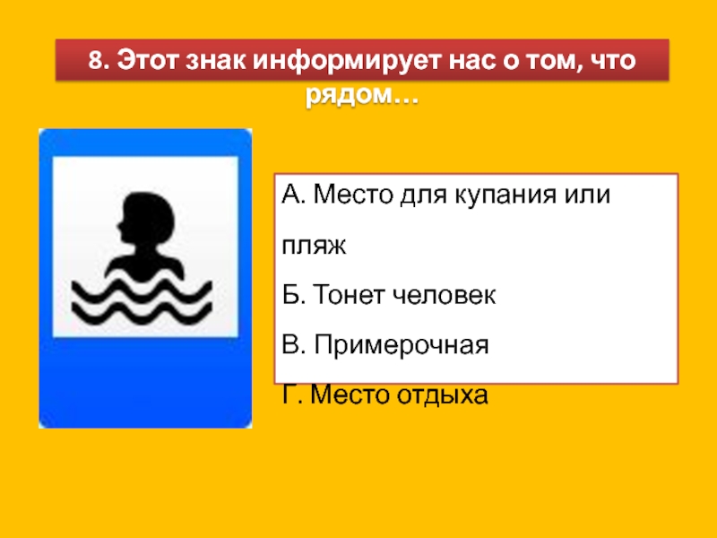 8. Этот знак информирует нас о том, что рядом…А. Место для купания или пляжБ. Тонет человекВ. ПримерочнаяГ.