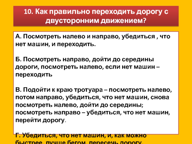 10. Как правильно переходить дорогу с двусторонним движением?А. Посмотреть налево и направо, убедиться , что нет машин,