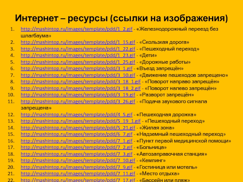 Интернет – ресурсы (ссылки на изображения)http://mashintop.ru/images/template/pdd/1_2.gif - «Железнодорожный переезд без шлагбаума»http://mashintop.ru/images/template/pdd/1_15.gif - «Скользкая дорога»http://mashintop.ru/images/template/pdd/1_22.gif - «Пешеходный переход»http://mashintop.ru/images/template/pdd/1_23.gif