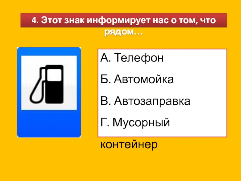 4. Этот знак информирует нас о том, что рядом…А. ТелефонБ. АвтомойкаВ. АвтозаправкаГ. Мусорный контейнер