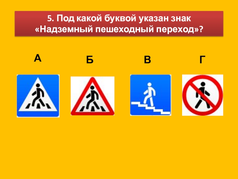 5. Под какой буквой указан знак «Надземный пешеходный переход»?А Б В Г