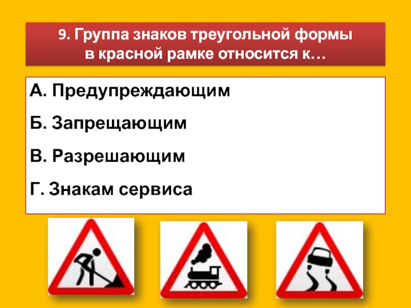 9. Группа знаков треугольной формы в красной рамке относится к… А. ПредупреждающимБ. ЗапрещающимВ. РазрешающимГ. Знакам сервиса