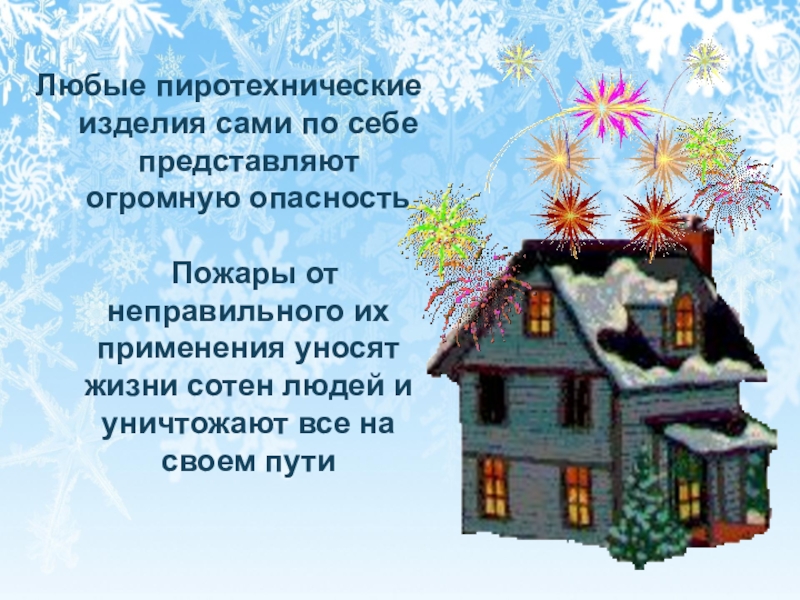 Слайд 15 Любые пиротехнические изделия сами по себе представляют огромную опасность