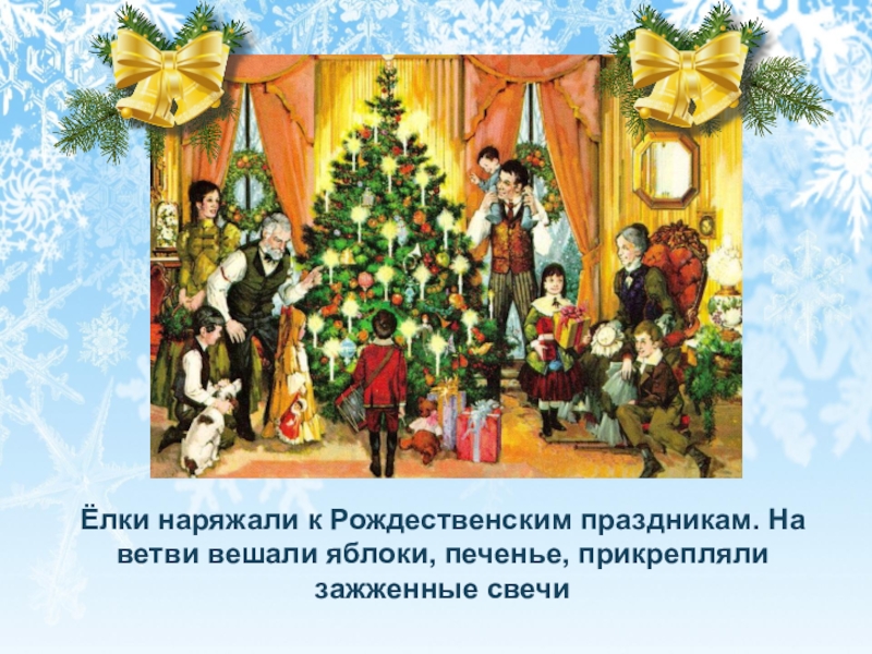 Слайд 11Ёлки наряжали к Рождественским праздникам. На ветви вешали яблоки, печенье, прикрепляли