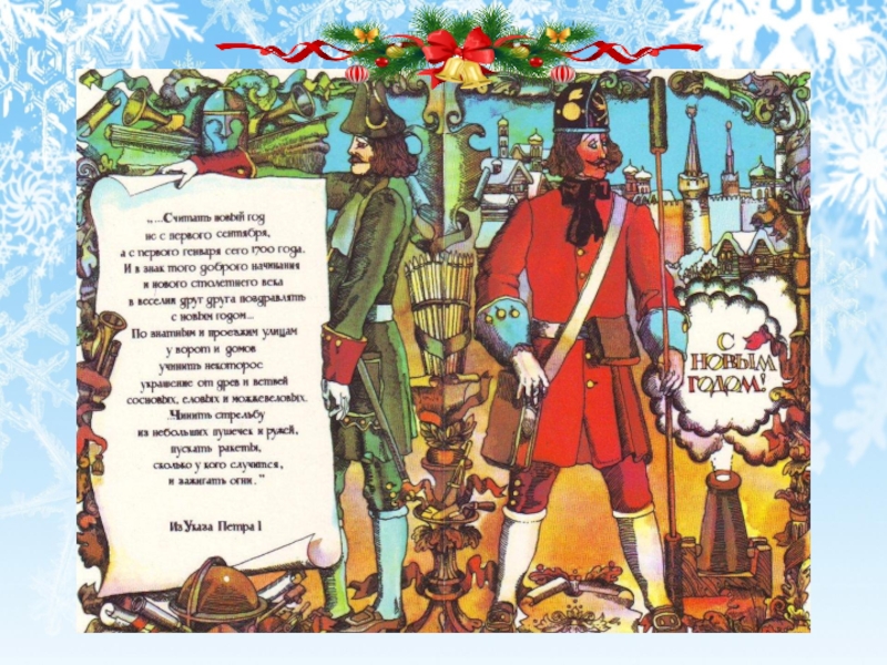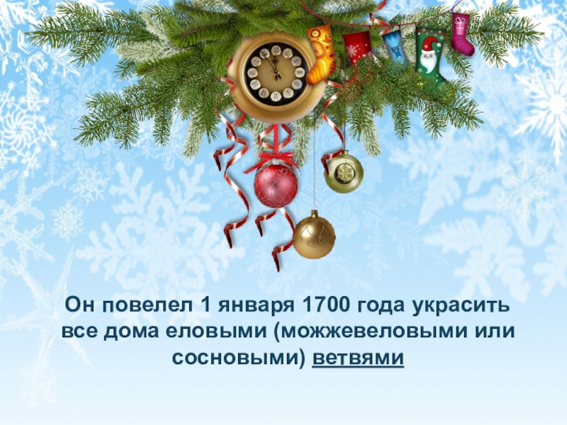 Слайд 9Он повелел 1 января 1700 года украсить все дома еловыми (можжевеловыми