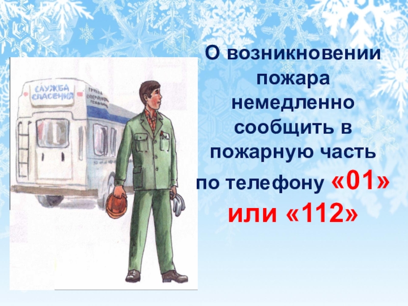 Слайд 20О возникновении пожара немедленно сообщить в пожарную часть по телефону