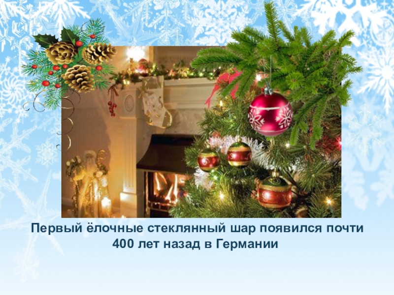 Слайд 12Первый ёлочные стеклянный шар появился почти 400 лет назад в Германии