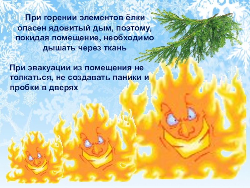 Слайд 17 При горении элементов ёлки опасен ядовитый дым, поэтому, покидая