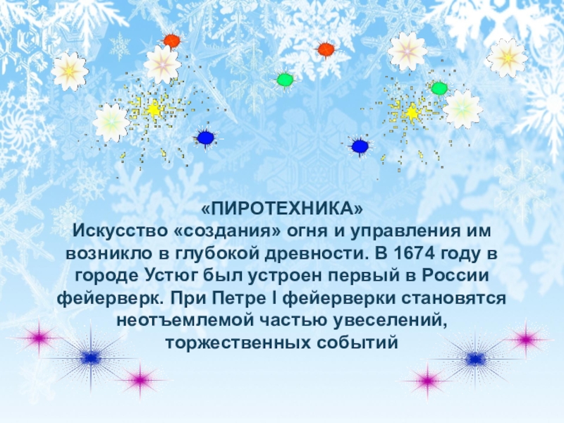 В 1674 году в городе Устюг был устроен первый в России фейерверк. При Петре I фейерверки становятся неотъемлемой частью увеселений, торжественных событий