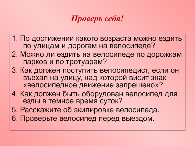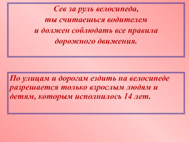 По улицам и дорогам ездить на велосипеде разрешается только взрослым людям и детям, которым исполнилось 14 лет.