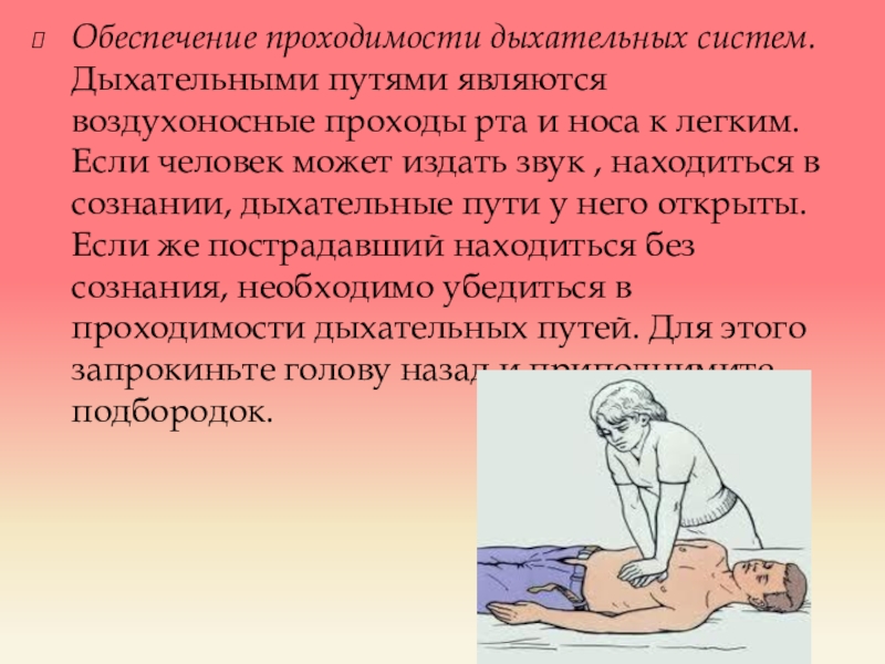 носа к легким. Если человек может издать звук , находиться в сознании, дыхательные пути у него открыты. Если же пострадавший находиться без сознания, необходимо убедиться в проходимости дыхательных путей. Для этого запрокиньте голову назад и приподнимите подбородок.