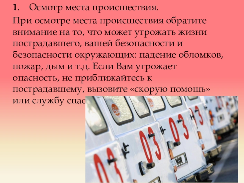 то, что может угрожать жизни пострадавшего, вашей безопасности и безопасности окружающих: падение обломков, пожар, дым и т.д. Если Вам угрожает опасность, не приближайтесь к пострадавшему, вызовите «скорую помощь» или службу спасения 112.