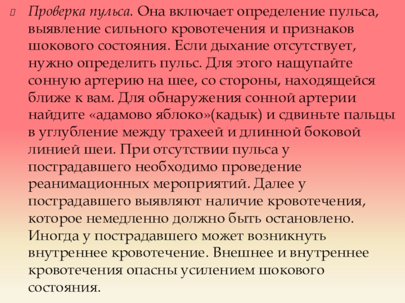 Слайд 8Проверка пульса. Она включает определение пульса, выявление сильного кровотечения и признаков