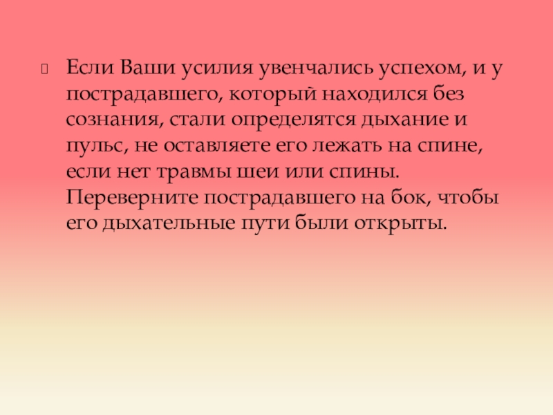 Слайд 9Если Ваши усилия увенчались успехом, и у пострадавшего, который находился без