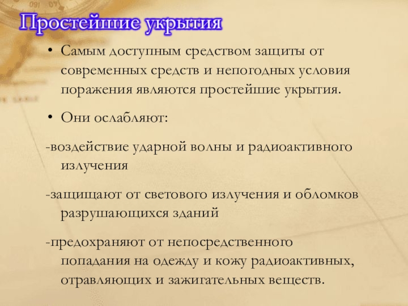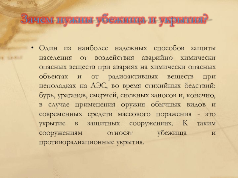 опасных веществ при авариях на химически опасных объектах и от радиоактивных веществ при неполадках на АЭС, во время стихийных бедствий: бурь, ураганов, смерчей, снежных заносов и, конечно, в случае применения оружия обычных видов и современных средств массового поражения - это укрытие в защитных сооружениях. К таким сооружениям относят убежища и противорадиационные укрытия.