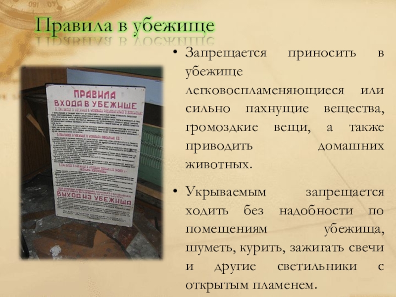 Слайд 7Запрещается приносить в убежище легковоспламеняющиеся или сильно пахнущие вещества, громоздкие вещи,