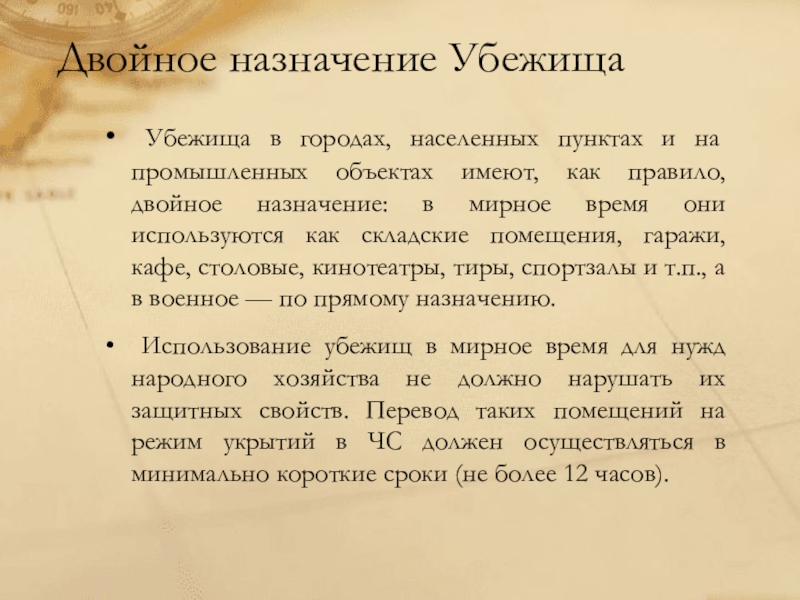 Использование убежищ в мирное время для нужд народного хозяйства не должно нарушать их защитных свойств. Перевод таких помещений на режим укрытий в ЧС должен осуществляться в минимально короткие сроки (не более 12 часов).