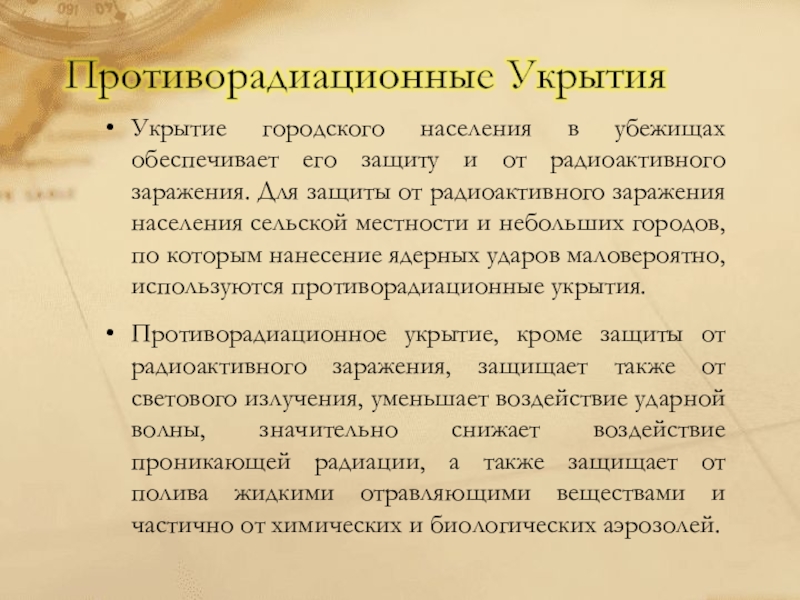 Слайд 10Укрытие городского населения в убежищах обеспечивает его защиту и от радиоактивного