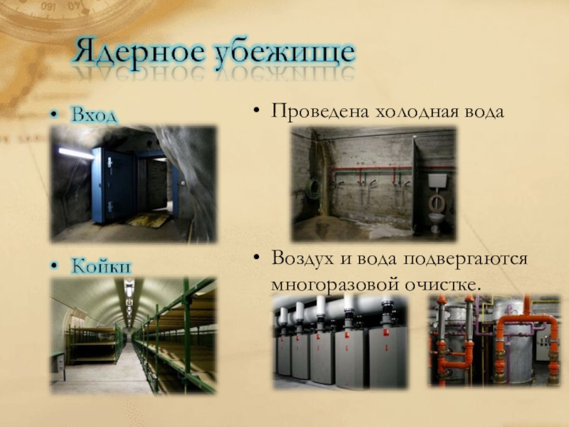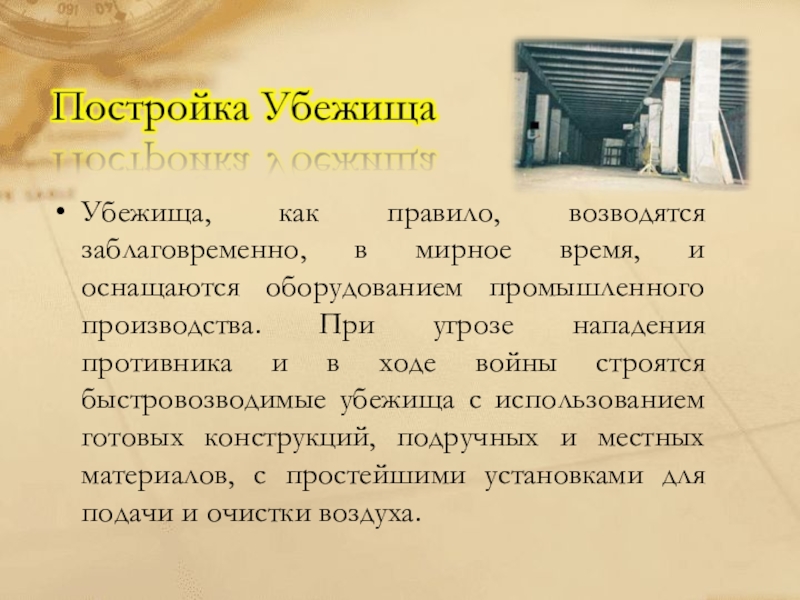 Слайд 5Убежища, как правило, возводятся заблаговременно, в мирное время, и оснащаются оборудованием