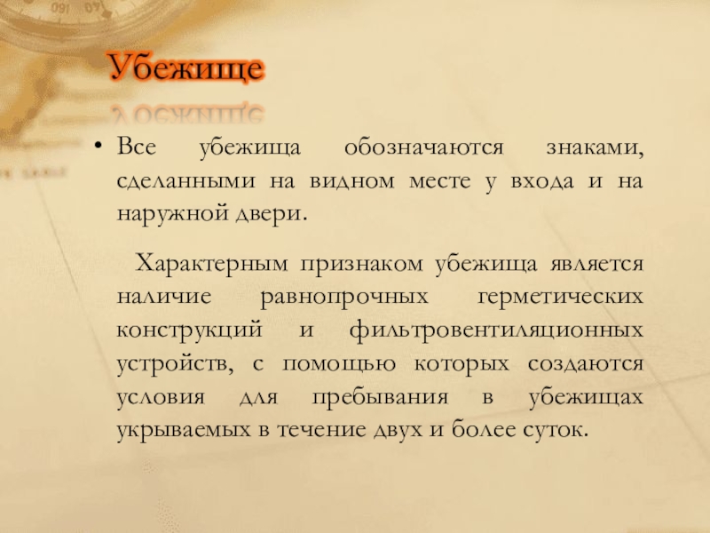 Характерным признаком убежища является наличие равнопрочных герметических конструкций и фильтровентиляционных устройств, с помощью которых создаются условия для пребывания в убежищах укрываемых в течение двух и более суток.