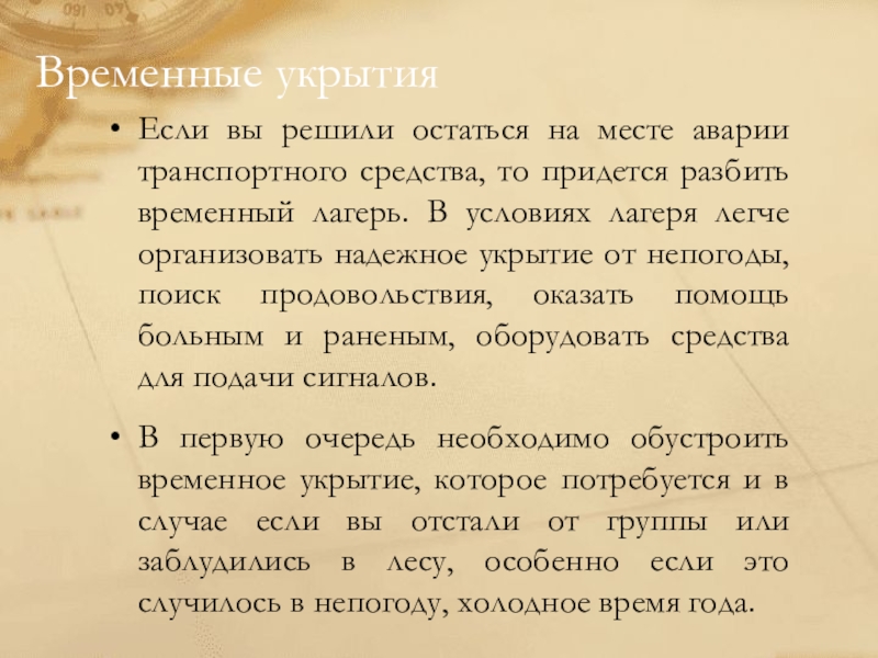 придется разбить временный лагерь. В условиях лагеря легче организовать надежное укрытие от непогоды, поиск продовольствия, оказать помощь больным и раненым, оборудовать средства для подачи сигналов.