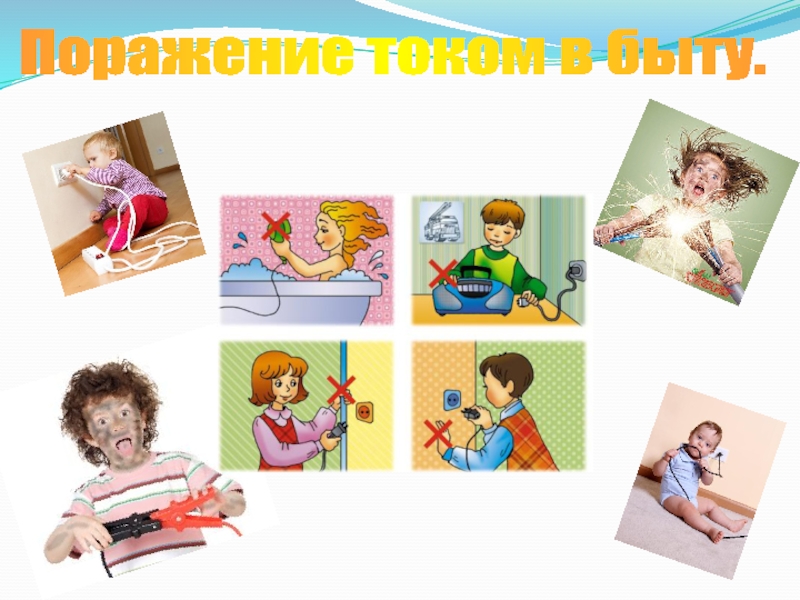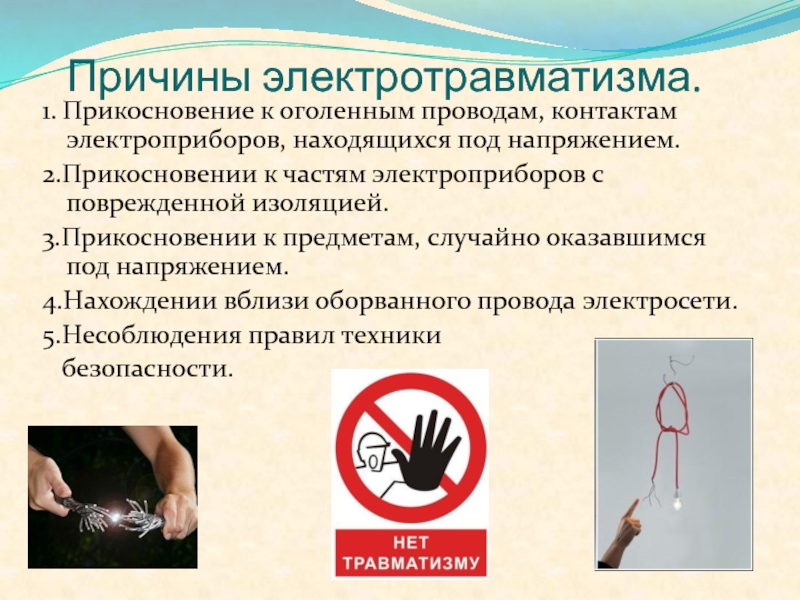 Причины электротравматизма.   1. Прикосновение к оголенным проводам, контактам электроприборов, находящихся под напряжением.2.Прикосновении к частям электроприборов