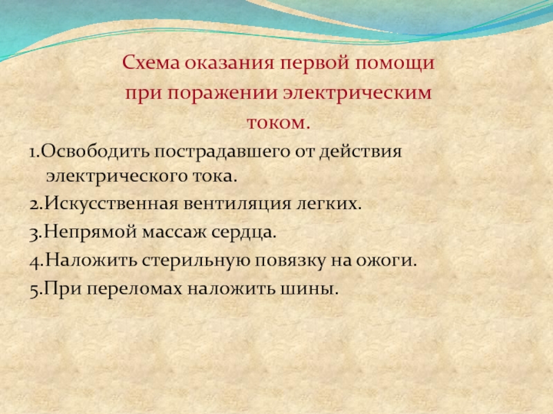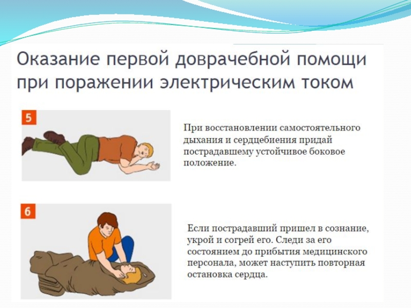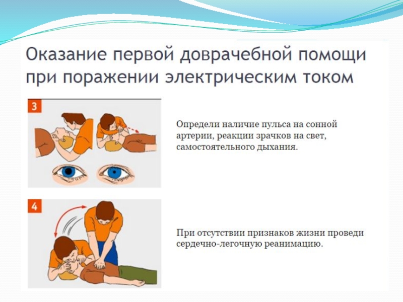 Схема оказания первой помощи при поражении электрическим током.1.Освободить пострадавшего от действия электрического тока.2.Искусственная вентиляция легких.3.Непрямой массаж