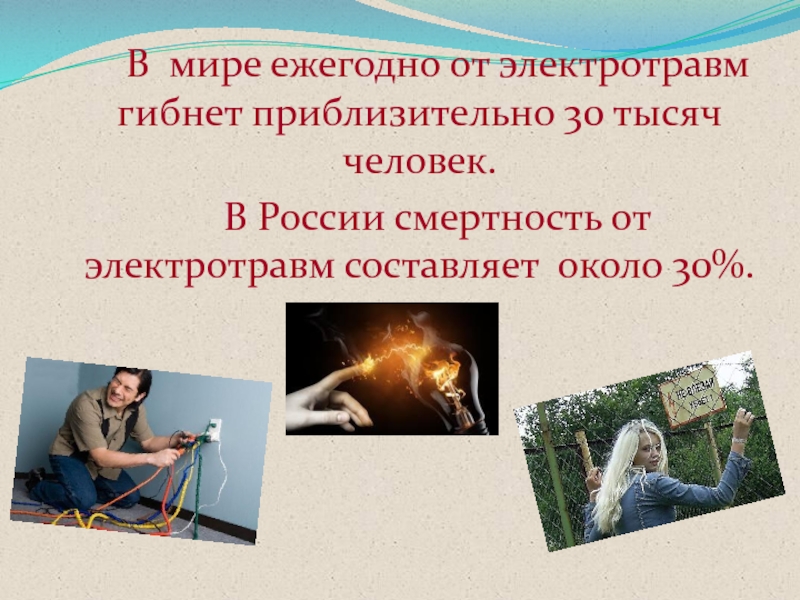 В мире ежегодно от электротравм гибнет приблизительно 30 тысяч человек.   В России