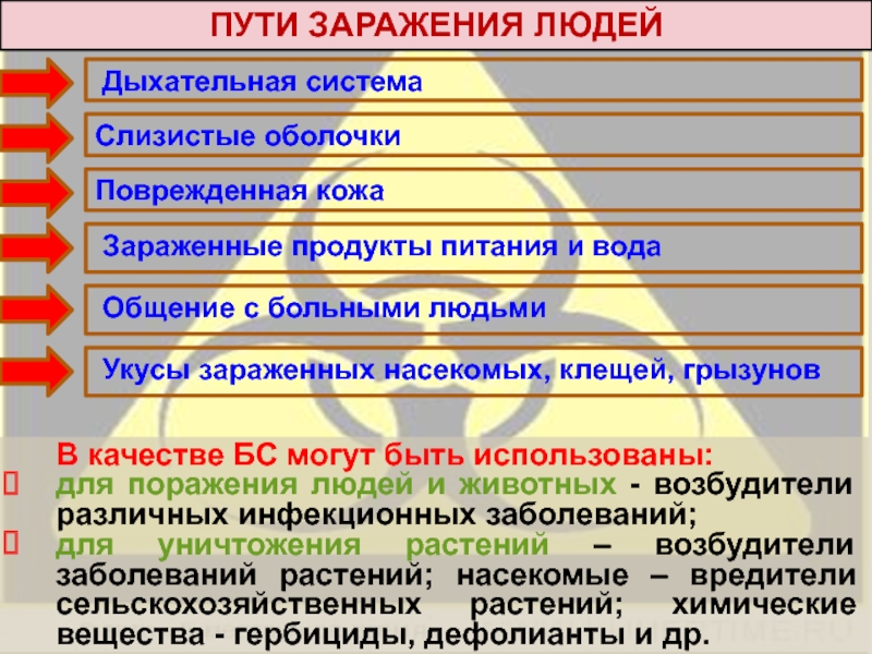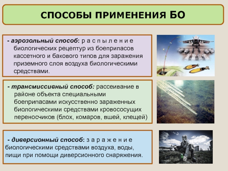 - трансмиссивный способ: рассеивание в районе объекта специальными боеприпасами искусственно зараженных биологическими средствами кровососущих переносчиков (блох, комаров, вшей, клещей)