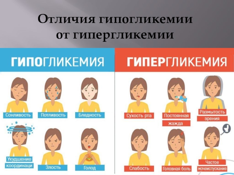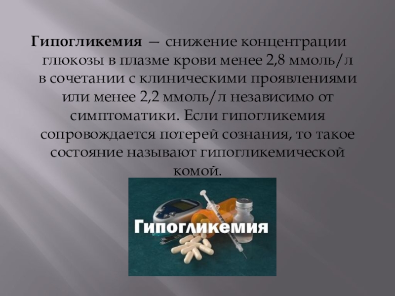 Слайд 2Гипогликемия — снижение концентрации глюкозы в плазме крови менее 2,8 ммоль/л
