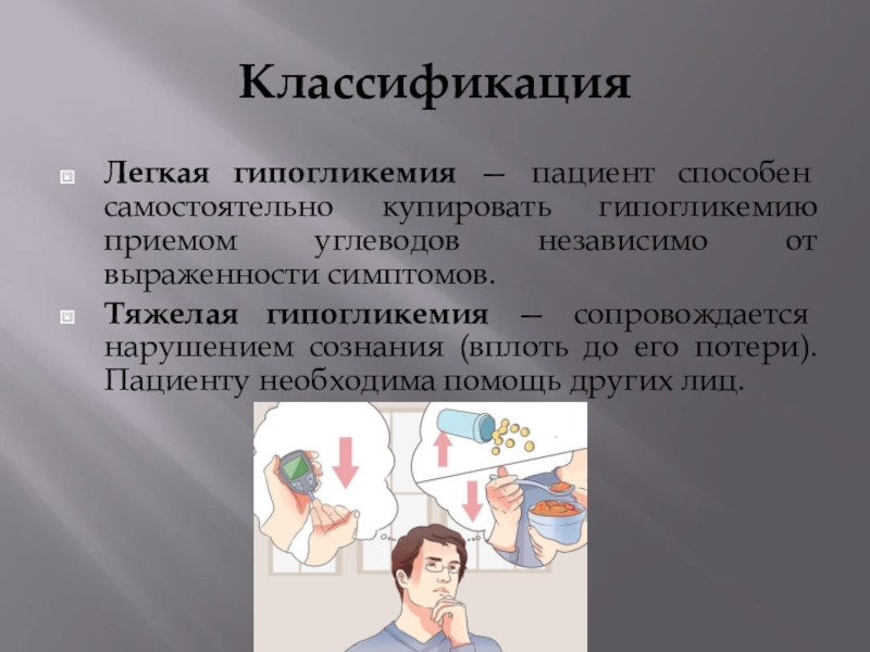 КлассификацияЛегкая гипогликемия — пациент способен самостоятельно купировать гипогликемию приемом углеводов независимо от выраженности симптомов. Тяжелая гипогликемия —