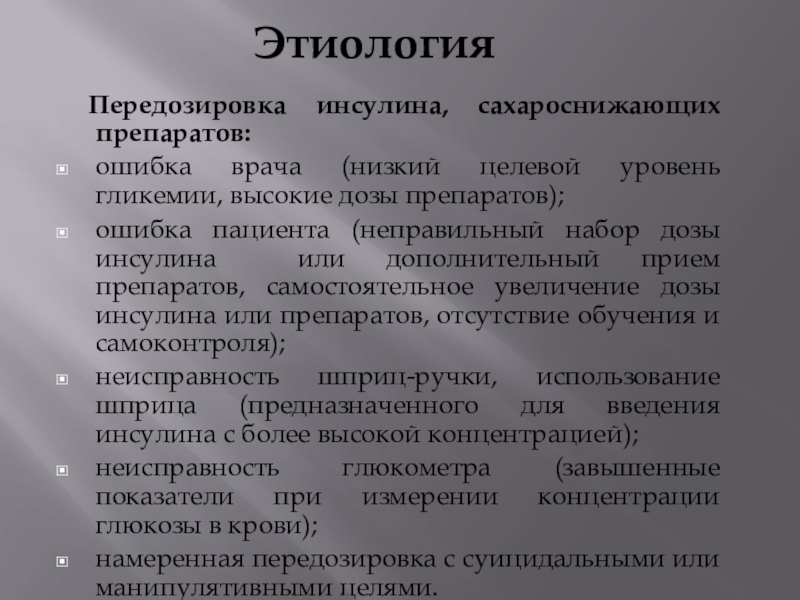 Этиология	Передозировка инсулина, сахароснижающих препаратов: ошибка врача (низкий целевой уровень гликемии, высокие дозы препаратов); ошибка пациента (неправильный набор