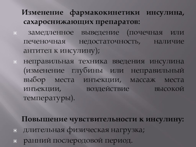 Изменение фармакокинетики инсулина, сахароснижающих препаратов: замедленное выведение (почечная или печеночная недостаточность, наличие антител к инсулину); неправильная техника