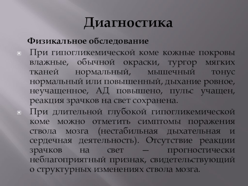 Диагностика	Физикальное обследование При гипогликемической коме кожные покровы влажные, обычной окраски, тургор мягких тканей нормальный, мышечный тонус нормальный