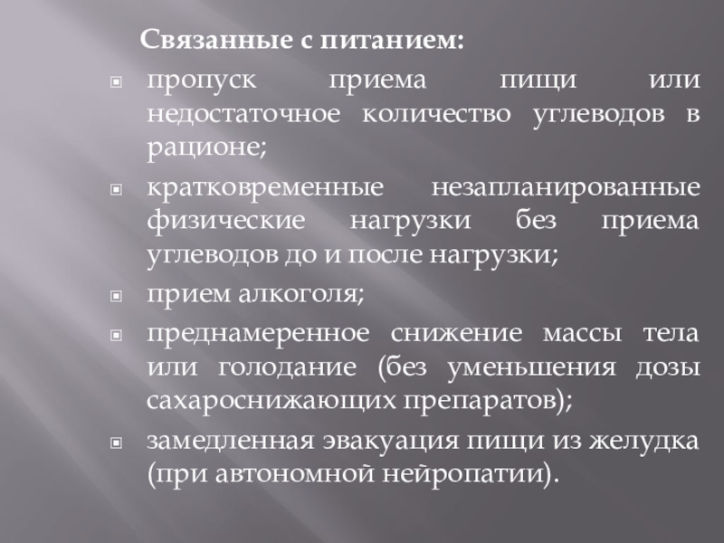 Связанные с питанием:пропуск приема пищи или недостаточное количество углеводов в рационе; кратковременные незапланированные физические нагрузки без приема