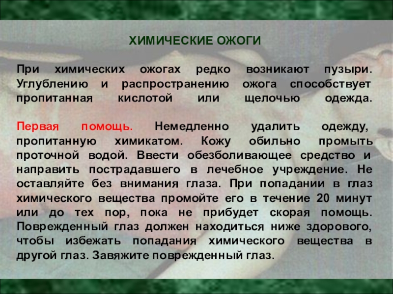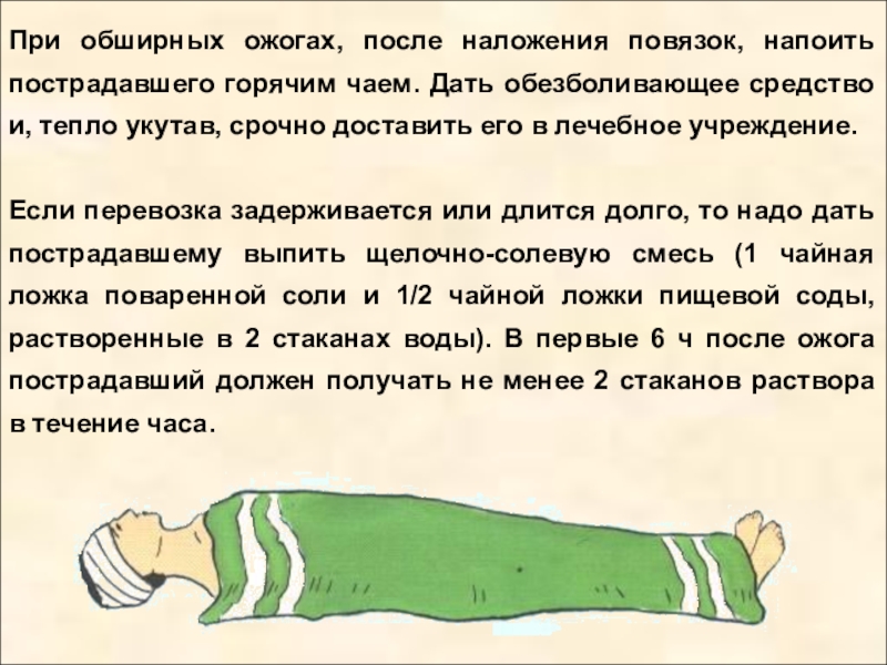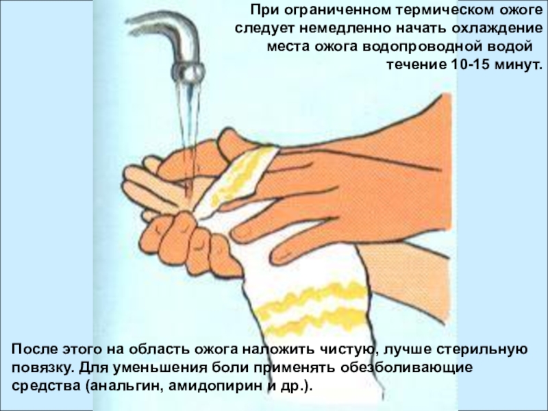 После этого на область ожога наложить чистую, лучше стерильную повязку. Для уменьшения боли применять обезболивающие средства (анальгин, амидопирин и др.).