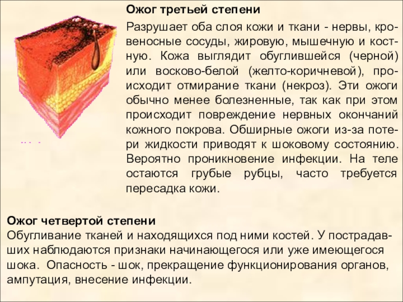 Разрушает оба слоя кожи и ткани - нервы, кро-веносные сосуды, жировую, мышечную и кост-ную. Кожа выглядит обуглившейся (черной) или восково-белой (желто-коричневой), про-исходит отмирание ткани (некроз). Эти ожоги обычно менее болезненные, так как при этом происходит повреждение нервных окончаний кожного покрова. Обширные ожоги из-за поте-ри жидкости приводят к шоковому состоянию. Вероятно проникновение инфекции. На теле остаются грубые рубцы, часто требуется пересадка кожи.