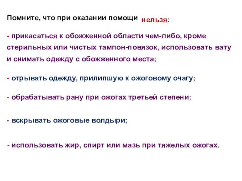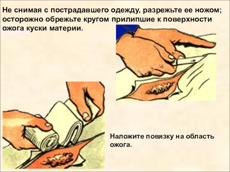 - отрывать одежду, прилипшую к ожоговому очагу;
