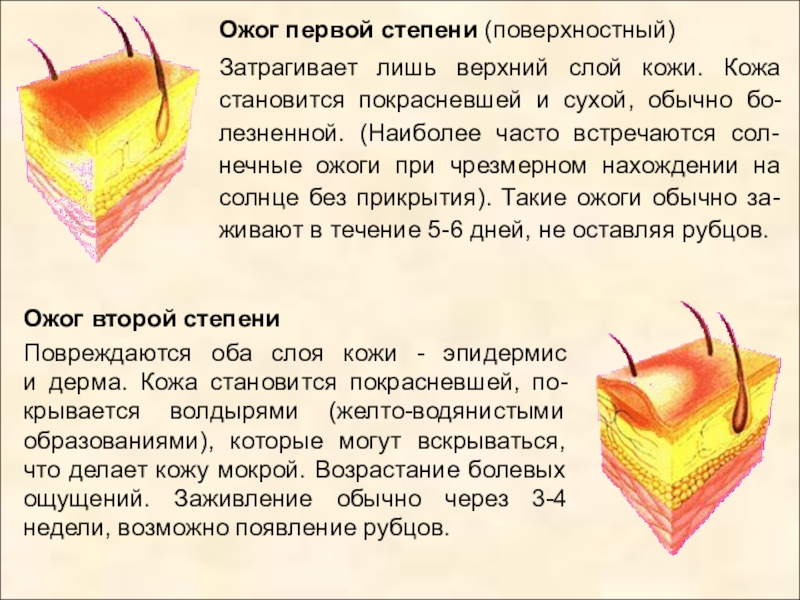и дерма. Кожа становится покрасневшей, по-крывается волдырями (желто-водянистыми образованиями), которые могут вскрываться, что делает кожу мокрой. Возрастание болевых ощущений. Заживление обычно через 3-4 недели, возможно появление рубцов.