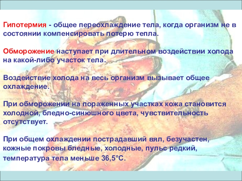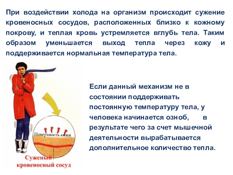 При воздействии холода на организм происходит сужение кровеносных сосудов, расположенных близко к кожному покрову, и теплая кровь устремляется вглубь тела. Таким образом уменьшается выход тепла через кожу и поддерживается нормальная температура тела.