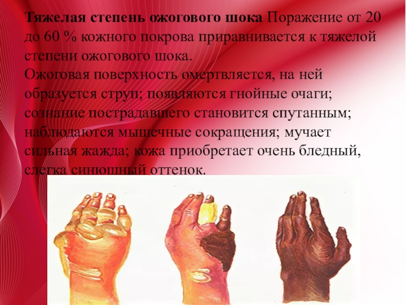 Слайд 9Тяжелая степень ожогового шока Поражение от 20 до 60 % кожного