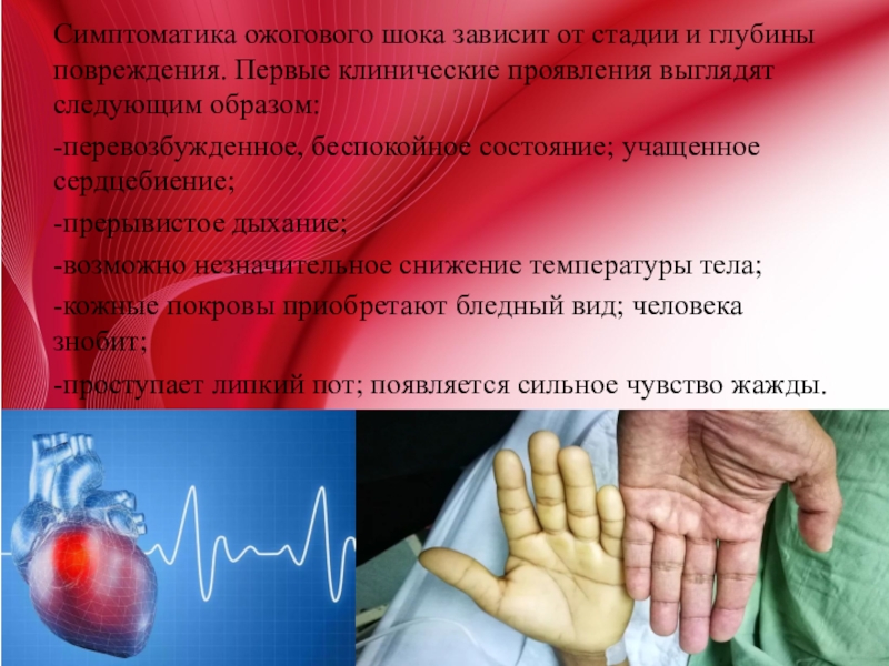 Слайд 5Симптоматика ожогового шока зависит от стадии и глубины повреждения. Первые клинические